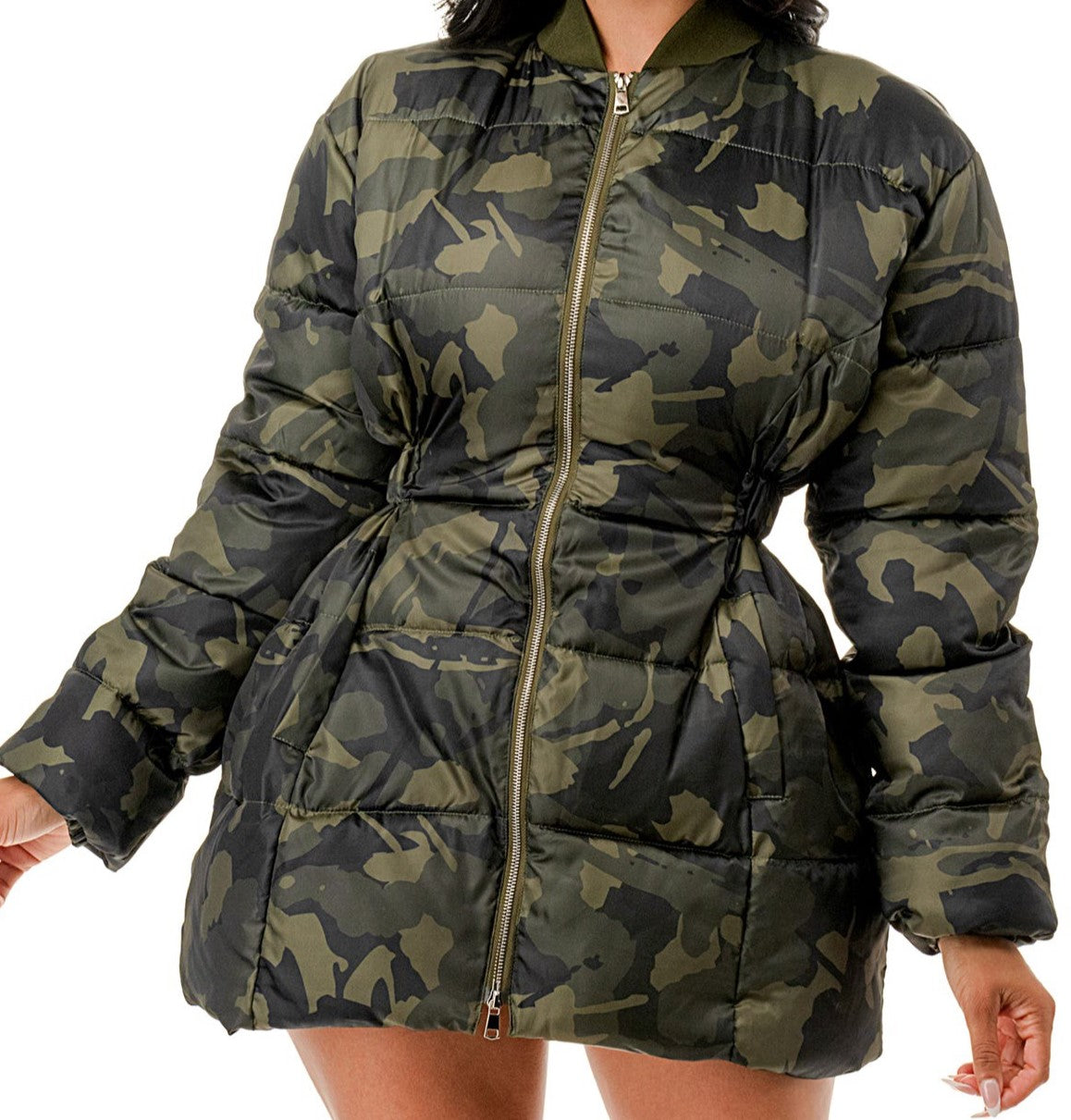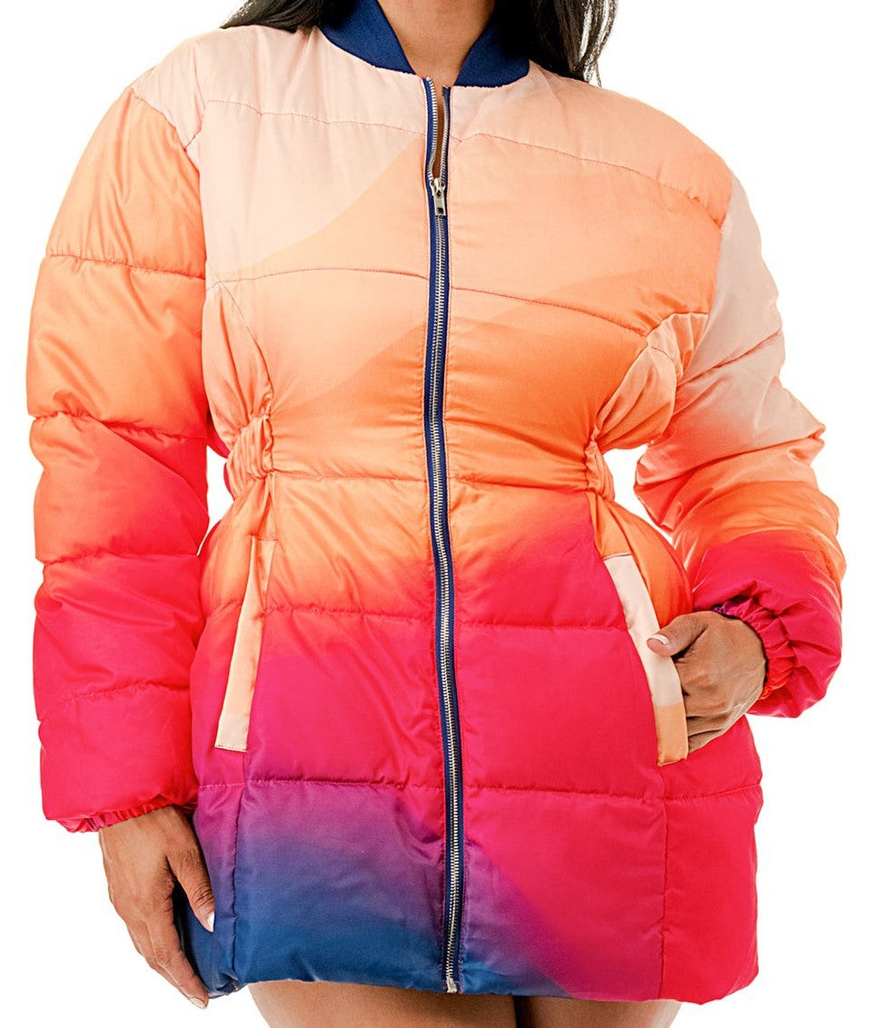 Long Sleeves Elastic Waist Front Zip Closure Puffer Jacket