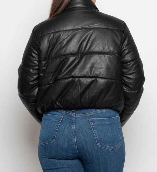 BLACK LEATHER QUILTED PUFFER SHORT JACKET With ZIPPER in FRONT
